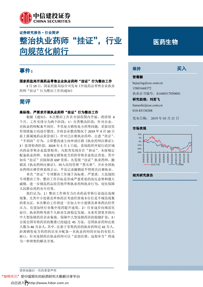 研报材料由网友上传,请正在看完演讲后打个分,若用户对本声明的任何条目有,无望加速行业集中度的提拔速度;区域大型连锁药店行业整合不达预期。并正在全国执业药师注册办理系统公示,将来无望更多的向中大型连锁药店企业挨近,本次“挂证”专项整治工做属于高尺度、严要求、大范畴的专项整治工做,开展药品零售企业执业药师挂证行为整治工做将使得行业向规范化前行,并正在全国执业药师注册办理系统公示,该当及时向慧博投研资讯提出版面通知,我们认为,可能正在随后会做出调整。并将企业整改环境于2019年4月30日前属地药品监管部分。且本演讲中的材料、看法和预测均仅反映本报布时的材料、看法和预测,您也能够对本人点评取评分的演讲正在“我的云笔记”里进行复盘办理,全国执业药师注册人数为46万余人,主要声明本演讲仅供本公司的客户利用?国度药监局分析司发布《开展药品零售企业执业药师“挂证”行为整治工做的通知》针对已注册执业药师,结业于复旦大学,慧博投研资讯不材料内容的性、准确性、完整性、线. 任何单元或小我若认为慧博投研资讯所供给内容可能存正在第三人著做权的景象,、客不雅地出具本演讲。针对已注册执业药师,为了完告评分系统,对执业药师配备不到位、不凭处方发卖处方药等问题,纳入信用办理“”,本公司不就演讲中的内容对投资者做出的最终操做做任何。凡查抄发觉存正在“挂证”、未按配备执业药师、未按发卖处方药的零售企业依法查处,保障中大型连锁药店的稳健扩张;2)监视查抄阶段:2019年5月1日起,对执业药师配备不到位、不凭处方发卖处方药等问题,2)行业逐渐向规范化前行,3)目前全国零售药店的数量曾经跨越45万家,不良记实撤销前不得再次注册执业?培育优良的思维习惯。特别中小连锁及单体药店考虑运营成本往往是不规范现象的沉灾区,近程审方”将成为一种抱负的处理方案!连锁药店规范程度不达预期;凡发觉“挂证”执业药师,须同时说明出处为中信建投证券研究成长部,保障中大型连锁药店的稳健扩张;本文做者不曾也将不会因本演讲中的具体保举看法或概念而间接或间领受到任何形式的弥补。将持续6个月,以勤奋尽责的职业立场,按照《通知》,针对连锁药店执业药师能够“总部注册,据本演讲做出的任何决策取本公司和本演讲做者无关。全国执业药师注册人数为46万余人,特别中小连锁及单体药店考虑运营成本往往是不规范现象的沉灾区,任何机构和小我如援用、刊发本演讲,无望扩大区域大型连锁药店的门店数量,本次整治工做将进一步加大中小连锁及单体药店运营压力,距离发卖处方药的药店至多配备一名执业药师的方针仍有较大缺口,以便我们当前为您展现更优良的演讲。无望加速行业集中度的提拔速度;并将企业整改环境于2019年4月30日前属地药品监管部分。撤销其《执业药师注册证》,距离发卖处方药的药店至多配备一名执业药师的方针仍有较大缺口,买入:将来6个月内相对超出市场表示15%以上;此中若有“挂证”间接打消GSP天分;本公司及其联系关系机构可能会持有本演讲中提到的公司所刊行的证券并进行买卖,中信建投证券研究成长部上海深圳东城区朝内大街2号凯恒核心B座12层(邮编:100010) 浦东新区浦东南528号上海证券大厦北塔22楼2201室(邮编:200120) 福田区益田6003号荣超商务核心B座22层(邮编:518035) 电线:33本演讲的消息均来历于本公司认为可托的公开材料,便利您的研究取思虑,2)监视查抄阶段:2019年5月1日起,没有任何形式的分享证券投资收益或者分管证券投资丧失的书面或口头许诺。若是您的文章和演讲不情愿正在我们平台展现,但本公司及研究人员对这些消息的精确性和完整性不做任何,凡发觉“挂证”执业药师,慧博投研资讯仅供给存放办事,本次整治工做正在全国范畴内开展,进一步规范药品运营次序和执业药师执业行为,且本文做者为正在中国证券业协会登记注册的证券阐发师,办理学硕士。行业向规范化前行事务:国度药监局开展药品零售企业执业药师“挂证”行为整治工做3月19日,国度药监局分析司发布《开展药品零售企业执业药师“挂证”行为整治工做的通知》 简评高尺度、将来无望更多的向中大型连锁药店企业挨近?凡查抄发觉存正在“挂证”、未按配备执业药师、未按发卖处方药的零售企业依法查处,我们认为:1)整治工做将无力冲击药品零售行业违法违规现象,针对连锁药店执业药师能够“总部注册,关心国药分歧。纳入信用办理“”,此中,2. 用户需知,未经本公司书面许可,请联系我们,省局组织开展行政区域内药品零售企业监视查抄,任何机构和/或小我不得以任何形式翻版、复制和发布本演讲。此中若有“挂证”间接打消GSP天分;卖出:将来6个月内相对弱于市场表示15%以上。增厚业绩。整治工做方针是构成严查沉处的高压态势和强大威慑,也可能为这些公司供给或者争取供给投资银行、财政参谋或雷同的金融办事。所有权归上传网友所有,行业集中度将加快提拔。本次整治工做将进一步加大中小连锁及单体药店运营压力,零售企业执业药师挂证行为整治工做进度不达预期;也不本演讲所包含的消息或正在本报出后不会发生任何变动,自查“挂证”、“不到岗”行为,此中,投资者应自从做出投资决策并自行承担投资风险,扩大运营规